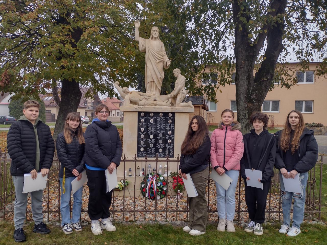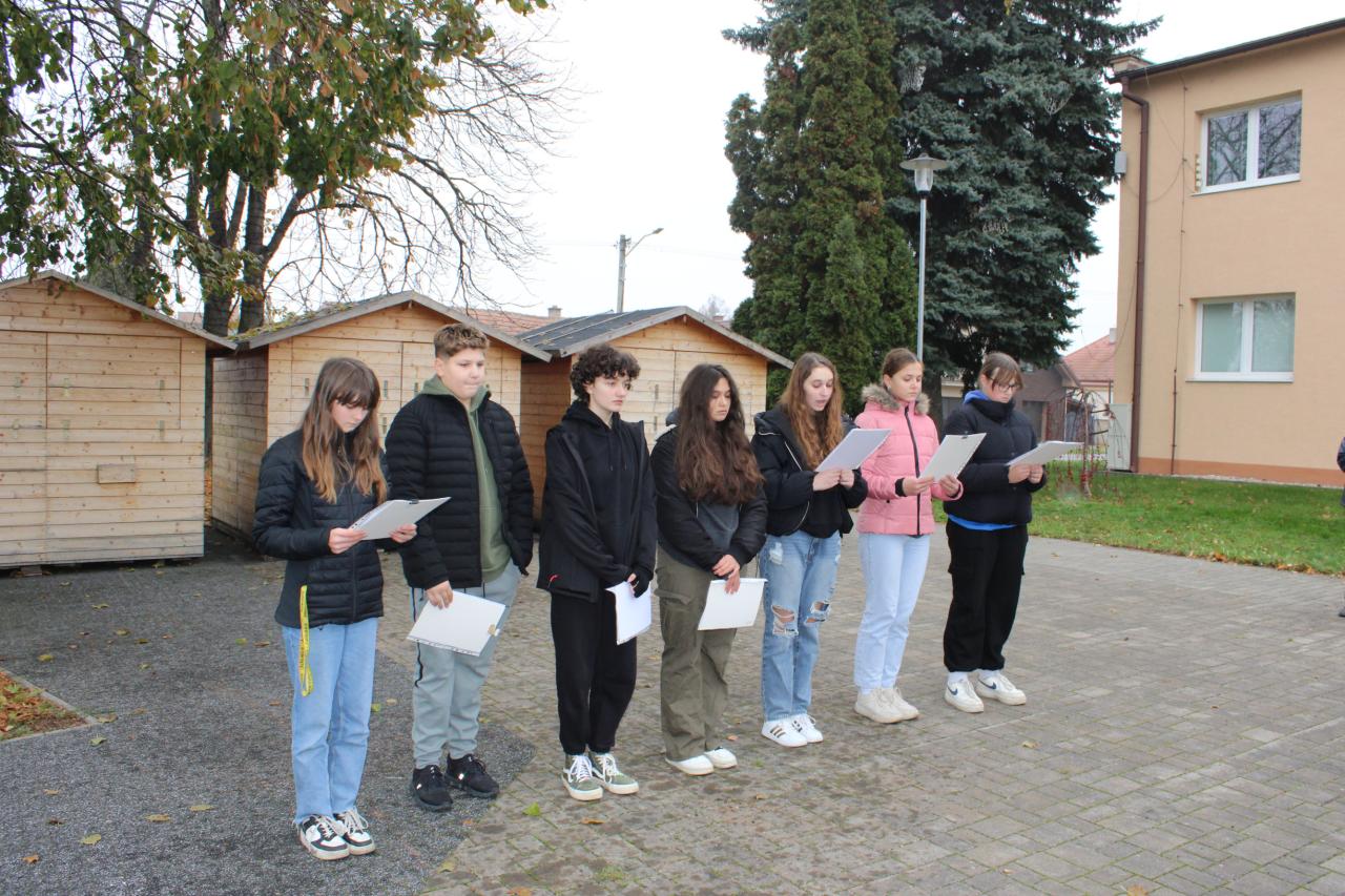 Veršami známej básne Na flámskych poliach otvorila Mgr. Hamerlíková spomienková slávnosť v piatok 11.11.2024 o 11. hodine a 11. minúte pri pamätníku obetiam prvej svetovej vojny.