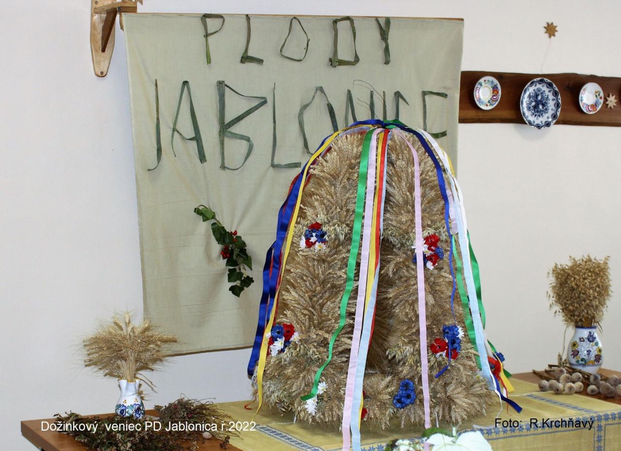 Pod týmto názvom sme uskutočnili výstavu ovocia, zeleniny a iných produktov z našich polí, lúk a záhrad. Mali sme čo vystavovať, lebo 23 ochotných pestovateľov prinieslo svoju úrodu v piatok 9. 9. 2022. No a sobota patrila otvoreniu výstavy, kde sa predstavili žiaci ZŠ so svojim programom a na harmonike zahral žiak ZUŠ David Černek. Po privítaní a úvodných slovách predsedníčky JD Kvetky Otépkovej, bol odovzdaný krásny dožinkový veniec predsedovi Mgr. Vladimírovi Blahovi z PD Záhorie Jablonica. Veniec odovzdali dve naše členky oblečené v jablonickom kroji, ktorý k takejto tradičnej udalosti rozhodne patrí. Bohatý veniec z obilia uvili naše seniorky pod vedením Anny Brezovskej. Stoly boli naaranžované množstvom zeleniny, ovocia, bylinkami, kvetmi a ostatnou úrodou. Návštevníci mali možnosť ochutnať syr, ponúknuť sa koláčikmi, či malým občerstvením. Výstava sa vydarila i napriek našej obave, či bude čo vystavovať po tak suchom lete. Potešili sme sa aj účasti starostu obce Ing. Silvestra Nestarca, ale i občanov, ktorí si výstavu prišli pozrieť. Najväčšia účasť pozerajúcich bola v pondelok, kedy si výstavu pozreli deti z MŠ a žiaci ZŠ, ktorým chutili nielen jablká, sladký medík, ale i ovocné cukríky.
